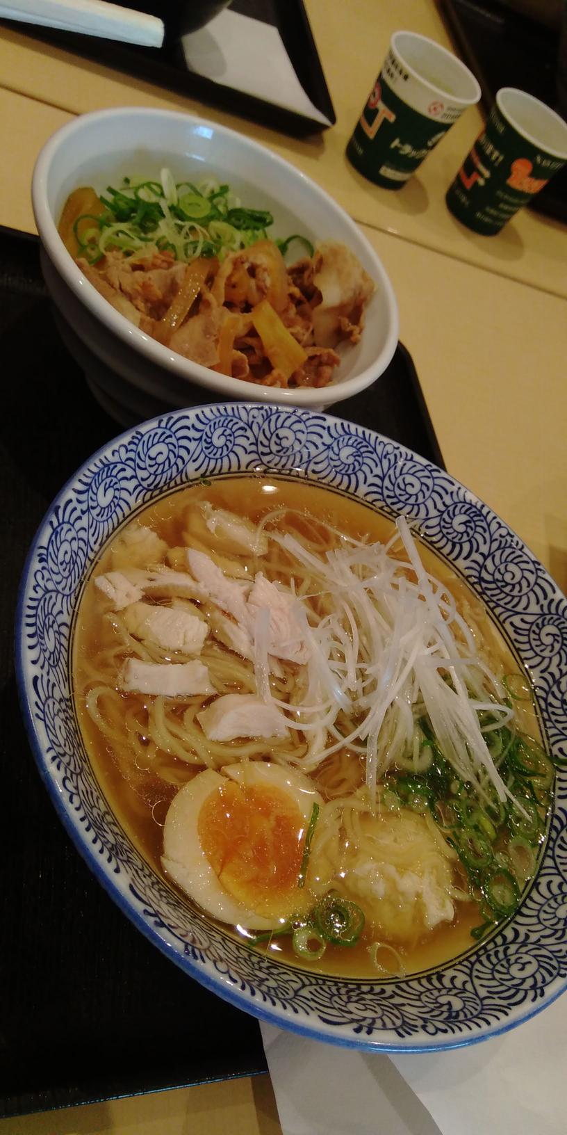 どんぶりは肉丼でそこそこのボリュームもあるし、味はうまいに決まってる。ラーメンは醤油と塩のスープの違いと、メンマがネギに変わったという以外同じ。